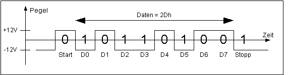 asynchron das oben beschriebene Datenbyte mit Start- und Stopbits.