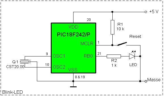 Das Pin RB0 des Port B wird mit einer Leuchtdiode versehen, die über 1 kOhm mit Masse verbunden ist. Damit zeigt die LED den Pegel des Bits 0 von PORTB an. Es eignet sich dafür die 28-Pin-Testplatine. |