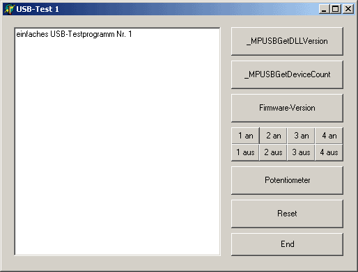 Auf einen Druck auf den zweiten Button hin (_MPUSBGetDeviceCount) ermittelt die DLL die Anzahl der angeschlossenen Testplatinen. Da nur eine Platine angeschlossen ist, lautet das Ergebnis 00000001. Ein Druck auf den dritten Button (Firmware-Version) liefert den Wert, der in der Datei user.h als MAJOR_VERSION & MINOR_VERSION definiert wurde. Das sollte 2.0 sein. Mit den 8 kleinen Buttons kann man die LEDs Nr. 1..3 (an den Pins RB0..RB3) ein- und ausschalten. Bei einem Druck auf Potentiometer wird die Spannung an AN0 (RA0) gemessen, und das Ergebnis ausgegeben. (Angezeigt wird nicht die Spannung in Volt sondern die beiden Ergebnisbytes des ADC mit einem Dezimalpunkt als Trennzeichen. Daraus kann man aber die Spannung errechnen.) Ein Druck auf Reset setzt das USB-Device zurück. Es meldet sich ab und gleich darauf wieder an (was Windows mit dem üblichen Geräuschen begleitet). |