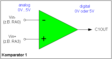 Das digitale Ausgangssignal kann auch auf ein Port-Pin wieder ausgegeben werden, üblicherweise wird aber dieser Ausgang vom PIC intern digital abgefragt. Der Ausgangspegel des Komparators ist im PIC nämlich einfach ein Bit in einem Register. Fragt man im Programm dieses Bit ab, dann weiß man, welche der beiden Spannungen momentan größer ist.
