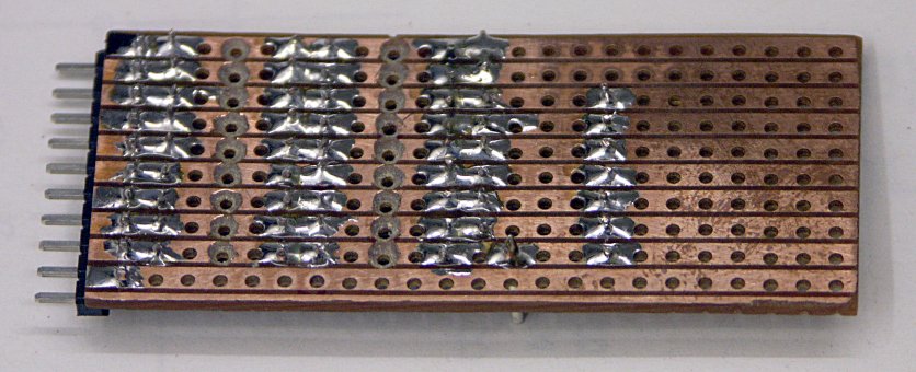 den Aufbau nötig sind. Es gibt Widerstände mit dem Wert 10k ("R") und Widerstände mit dem doppelten Wert von 20k ("2R"). Deshalb nennt man so ein Netzwerk auch R/2R-Netzwerk. Ein R/2R-Netzwerk lässt sich um beliebig viele Bits erweitern, indem man weitere R/2R-Widerstandspärchen an die Kette anschließt. R/2R-Netzwerke gibt es eigentlich auch als Fertigbaugruppen zu kaufen, aber bei den üblichen Verdächtigen bin ich in letzter Zeit nicht fündig geworden. Wenn man aber eine Tüte Widerstände zu hause liegen hat, baut man sowas schnell selbst. Ich verwende Metallschichtwiderstände mit 1% Toleranz. Im Interesse hoher Genauigkeit verwende ich als "2R"-Widerstand einfach zwei "R"-Widerstände in Reihe. Der genaue Wert von R ist dabei unwichtig. 10 kOhm ist nur eine grobe Orientierung.