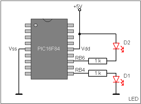 Im nebenstehenden Bild sind zwei Möglichkeiten für den Anschluss von Leuchtdioden gezeigt. D1 leuchtet auf, wenn RB4 Hig-Pegel führt, D2 leuchtet wenn RB6 Low-Pegel hat. Die Größe des Vorwiderstandes hängt von der gewünschten Leuchtstärke ab. Bei 1 Kiloohm fließen durch eine LED ca. 3,5 mA, was normalerweise ausreicht. Bei Bedarf kann der Widerstand bis auf ca. 220 Ohm verringert werden (15 mA). Moderne low-current-LEDs sind für 2 .. 4 mA ausgelegt, normale Standard-Typen benötigen höhere Ströme (10 .. 15 mA). Die Werte gelten für rote (und in etwa auch für gelbe und grüne) LEDs. Blaue LEDs benötigen eine höhere Flussspannung. Hier müssen Widerstandswerte entsprechend den technischen Daten der LEDs festgelegt werden, die Widerstände fallen hier relativ klein aus. Wie sich eine große Anzahl von LEDs mit wenigen Pins ansteuern lässt, ist hier beschrieben. |