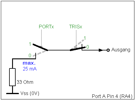 Um ein Pin eines Ports als Ausgang zu nutzen, muss es erst als Ausgang initialisiert werden, wozu das zugehörige Bit im TRISx-Register dieses Ports auf '0' gesetzt werden muss. Danach kann High und Low durch setzen und löschen des zugehörigen PORTx-Bits ausgegeben werden.