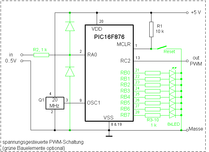 und einer 20-MHz Taktquelle für den PIC (z.B. Quarzgenerator). Die