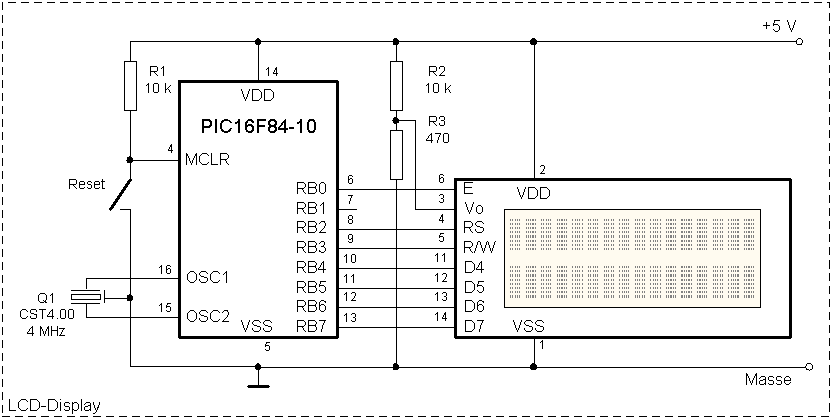 | RB0 | Signal "E" (enable) | selektiert das Display. Die Leitung muss aktiv sein, damit das Display auf andere Signale reagiert |