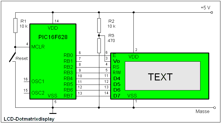 Dotmatrixdisplay. Das Display ist mit 7 Leitungen am Port B angeschlossen. Ein Schalter ist zwischen RB1 und Masse angeschlossen. Die Schaltung entspricht der LCD-Tastatur-Platine