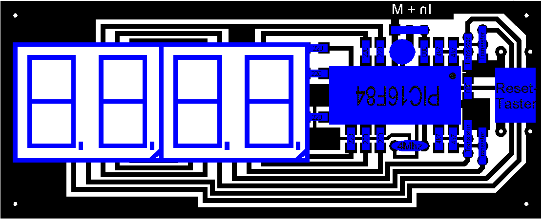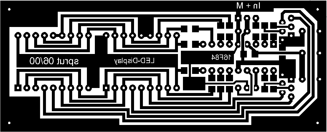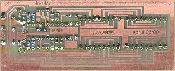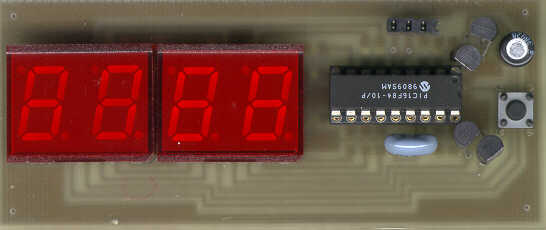 RB0-RB7 sind Ausgänge und liegen im Ruhezustand auf "1". Jedes dieser Pins steuert über einen Widerstand die Kathode eines Segments an. Der Widerstand begrenzt den Strom auf ca. 15 mA (rotes Display) bzw. 10mA (grünes Display). Die Pins RA0-RA3 sind Ausgänge und liegen im Ruhezustand auf "1". Sie steuern Treibertransistoren an, die die Anoden der LED-Anzeige mit +5V verbinden, wenn der entsprechende Ausgang auf "0" gelegt wird. Der Eingang am RA4 wird noch nicht benötigt. |