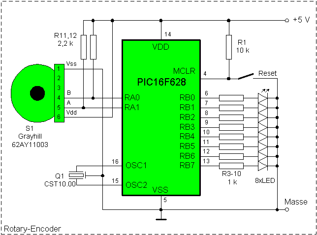 Der Rotary-Encoder benötigt eine 5V-Betriebsspannung, deshalb wird ihm Vss und Vdd (Pin 1 & 6) zugeführt. Außerdem hat der Encoder einen mechanischen Drucktaster, für dessen Nutzung ein PIC-Pin und ein weiterer Hochziehwiderstan nötig sind. Da ich in diesem Beispel diesen Kontakt (Pin 2 & 3) nicht benutze, fehlt die entsprechende Beschaltung im nebenstehenden Stromlaufplan. Für den Aufbau eignet sich eine 16F84/62x-Testplatine oder eine 16F84/62x-Minitestplatine mit angesteckter LED-Platine. |