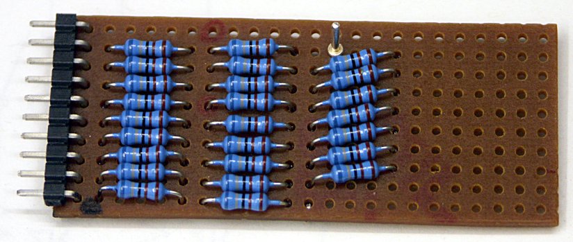 Ein DAC (digital-analog-converter) wandelt einen Zahlenwert in eine Spannung. Der Spannungspegel ist dabei dem Zahlenwert proportional. PIC-Controler haben keine integrierte DAC-Hardware, und so muss man einen DAC als externe Baugruppe anschließen. Ich habe mich hier für einen DAC mit R/2R-Widerstandsmatrix entschieden, da dieser schnell ist und sich in ein paar Minuten zusammenlöten lässt.