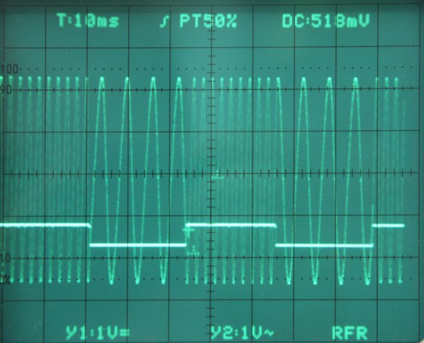 Später wird in der Sinus-Endlosschleife immer wieder getestet, ob der ADC mit einer Messung fertig ist. Ist das der Fall, dann wird der Messwert als Frequenz (f1 & f1+1) in das Programm übernommen und der ADC erneut gestartet. Liegt kein Messwert vor, dann geht das Programm in eine kleine Verzögerungsroutine, die genau so lange dauert, wie die Übernahme der Messwerte gedauert hätte. Das garantiert, dass jede Sinus-Schleife gleich lang ist.