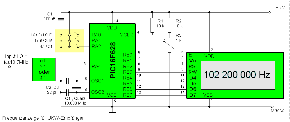 dem Eingang des Vorteilers verbunden wird. Die gemessene Frequenz wird