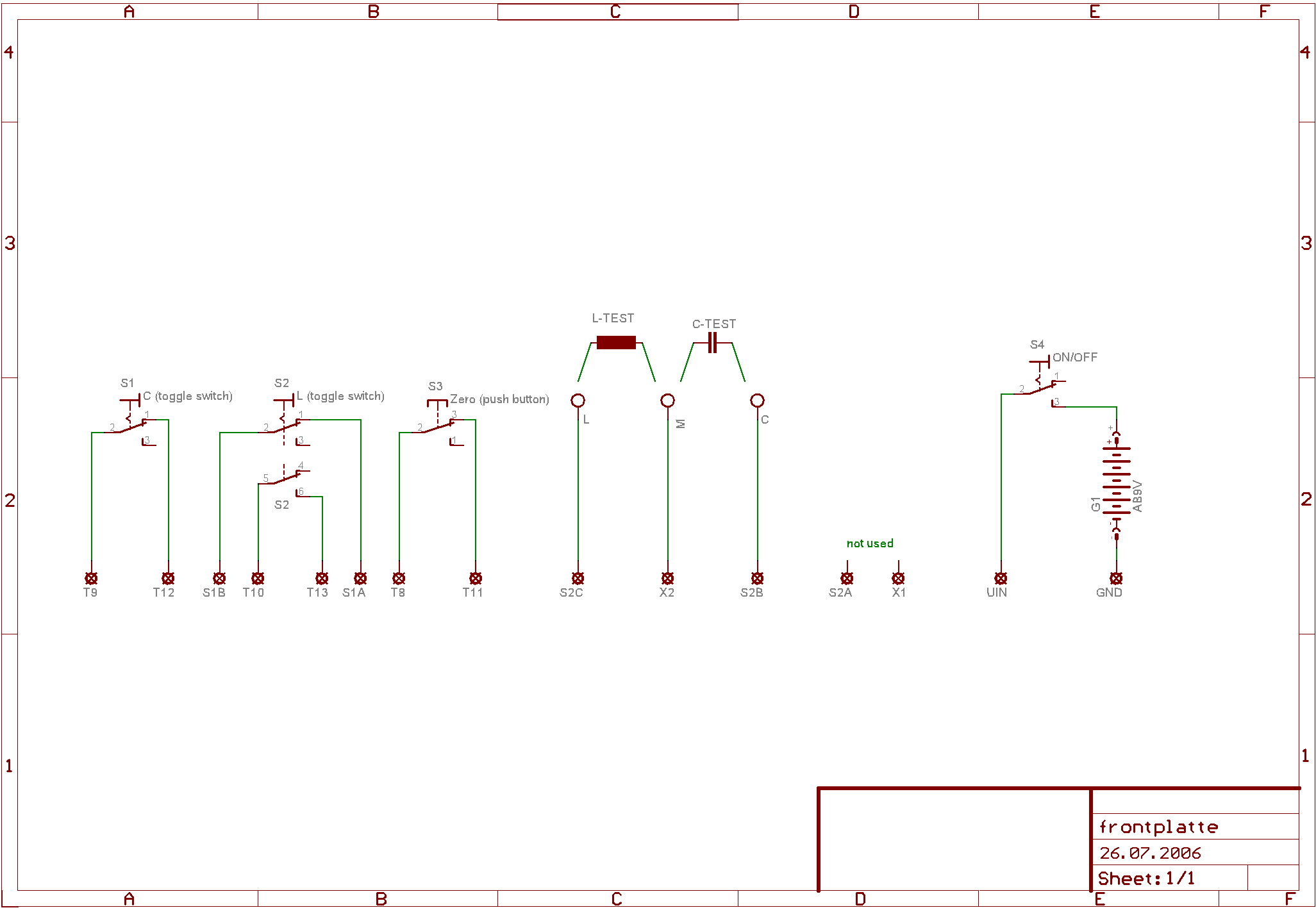 Neben der Platine werden einige weitere Bauteile benötigt, die (bis auf die Batterie) entsprechend diesem Stromlauplan in der Frontplatte montiert werden: