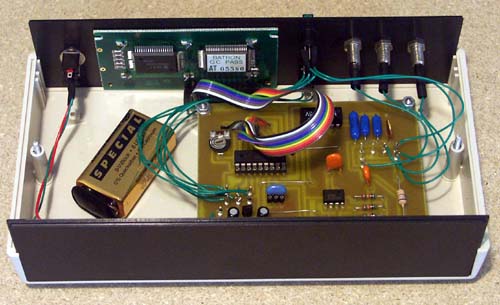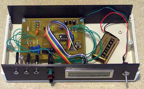 Zur Stromversorgung habe ich einen 9V-Block eingesetzt. Bei einer Stromaufnahme von ca. 10 mA sollte die Batterie viele Betriebsstunden lang durchhalten. Der Einfachheit halber ist die Batterie mit Klebeband am Geräteboden befestigt. Der Kontrast des LCD-Displays wird am 10kOhm-Potentiometer auf der Platine eingestellt. |