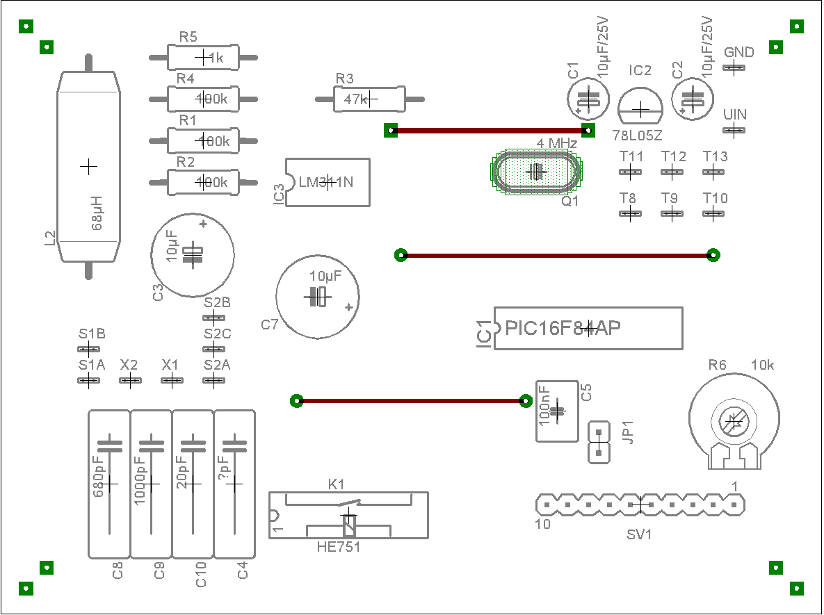 An dieser Stelle hat der ursprüngliche Entwickler dieses LC-Meters einen sehr gute Idee gehabt. Er kalibriert das Messgerät, indem er mit einem Relais einen eng tolerierten Kondensator von 1,02nF parallel zum Kondensator C schaltet. Dabei verändert sich natürlich auch die Schwingfrequenz. |