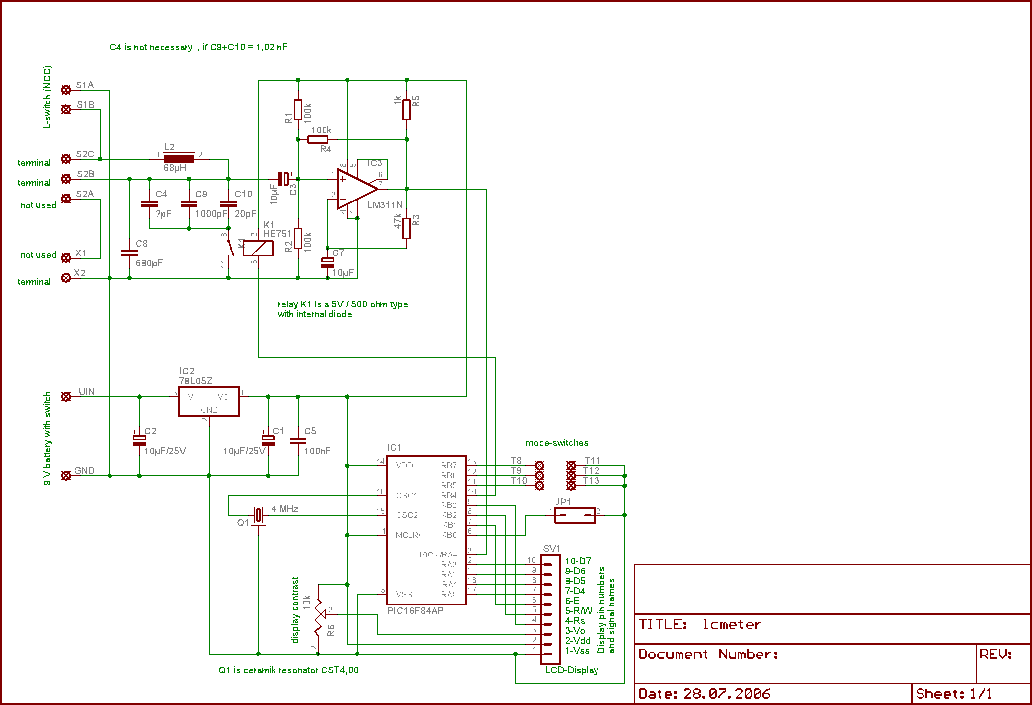 Wem ich nun genau für die Entwicklung dieses LC-Meters danken soll, weiss ich nicht, da die Urheberschaft nicht ohne weiteres nachvollziehbar ist. Auf jeden Fall handelt es sich um eines der besten Nachbauprojekte, die ich je gefunden habe, da es das Gerät erlaubt, mit geringem Aufwand Induktivitäten und Kapazitäten recht präzise zu ermitteln. Gerade wenn man sich mit Schaltreglern befasst, ist ein Induktivitätsmessgerät unablässig, und normale Digitalmultimeter haben keinen Induktivitätsmessbereich.