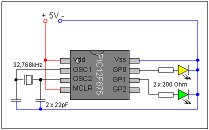 Zwischen OSC1 und OSC2 wird ein normaler 32,768-kHz-Uhrenquarz angeschlossen. Je ein 33pF-Kondensator verbindet OSC1 und OSC2 mit Masse (Vss). Der hier erzeugte 32,768-kHz-Takt wird über den 8:1 Vorteiler in den Timer1 gespeist.
