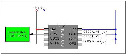 (Bei einem Reset wird der neue OSCCAL-Wert wieder aus dem EEPROM ausgelesen, und der PIC erzeugt die Sollfrequenz.)
