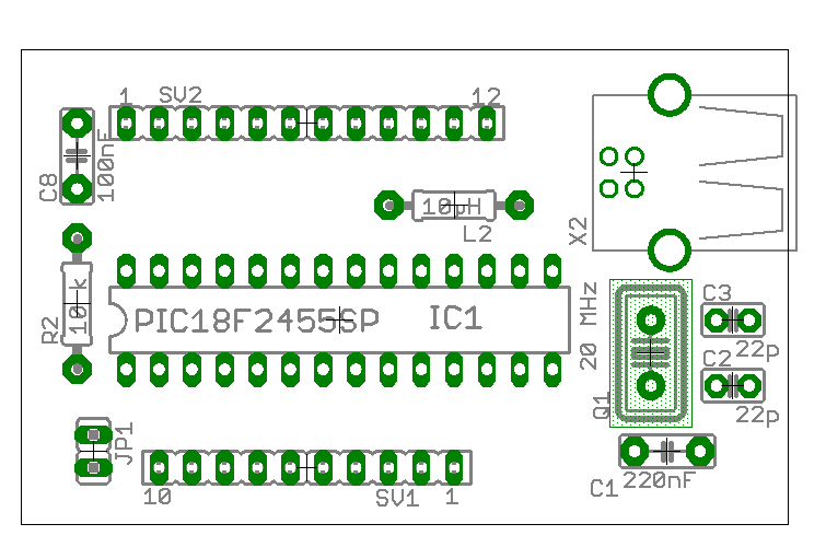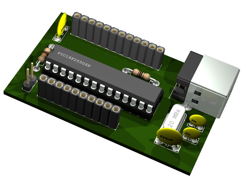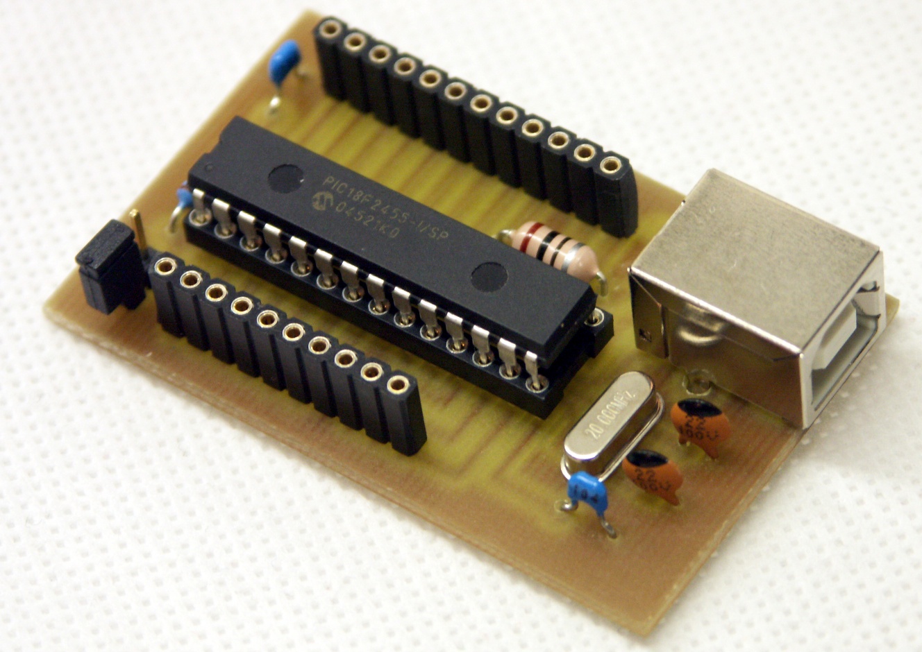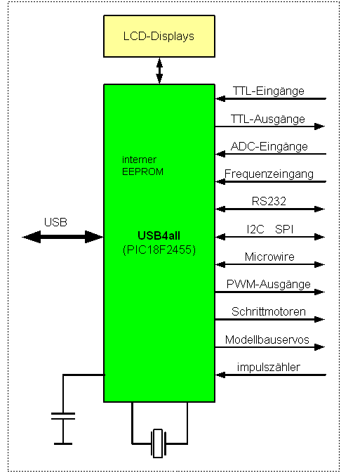 USB-Interface zu entwickeln. Viele Bastler haben aber nicht die Zeit, um tief in die Softwareinnereien des USB-Interfaces einzudringen. Sie hätten lieber eine fertige Lösung, die man als "Black-Box" in sein Bastelprojekt einbaut, und die alle USB-Probleme löst. So etwas gibt es schon: die IO-Warrior. Die Chips dieser Familie werden zu einem fairen Preis vertrieben, und vereinfachen die Entwicklung von USB-Geräten ungemein. Sie haben aber auch einige Schwächen und Grenzen. Deshalb habe ich auf Basis des PIC18F2455 meinen eigenen Interface-Chip entworfen, der meinen Ansprüchen eher genügt. Ich nenne ihn USB4all. Es gibt ihn in zwei Geschmacksrichtungen: