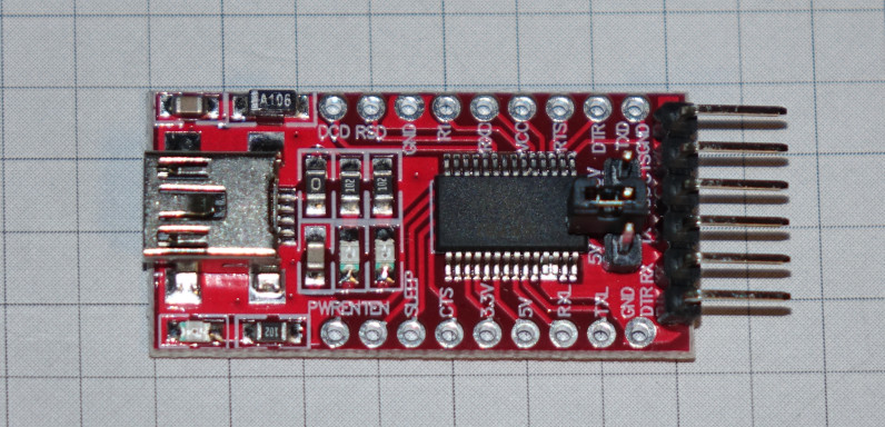 / USB-Wandler Der Sensor besitzt einen RS-232-Ausgang am Port GP4 (Pin 3). Letzterer ist eine Softwareemulation, da der PIC12F675 keine RS-232-Hardware besitzt. Die Polarität des RS-232-Ausgangs kann mit dem Jumper JP1 am Port GP3 (Pin 4) eingestellt werden. Wird hier GP3 mit GND verbunden (JP1: 2-3), dann kann der RS232-Ausgang direkt mit dem RX-Pin eines normalen RS232-Einganges verbunden werden. Der Höhe des erzeugten Signalpegels entspricht zwar nicht der RS232-Spezifikation, aber moderne Computer kommen damit erfahrungsgemäß problemlos zurecht (9600 Baud, 8 Bit, 1 Startbit, 1 Stopbit, keine Flusskontrolle). Oft werden heute aber RS232-USB-Wandlerplatinen günstig angeboten, die keinen RS232-Treiberchips haben und stattdessen mit TTL-Pegel arbeiten. Dafür ist dann eine inverse Polarität nötig. Die gibt der Sensor aus, wenn man GP3 mit 5V verbindet (JP1: 1-2). Im Stromlaufplan ist so eine TTL_Pegel-Wandlerplatine angedeutet, wie ich sie auch einsetze. Ein Foto sieht man rechts. Auf der Platine ist ein Jumper, den man auf "5V" setzen muss, damit der Sensor über das "VCC"-Pin mit 5V versorgt wird. Der Sensor gibt zyklisch (etwa alle 20ms ... 50ms) einen Textstring mit der momentanen Leistung und mit der Zahl der Scheibendrehungen aus: "W=00820W Ro:000075" |