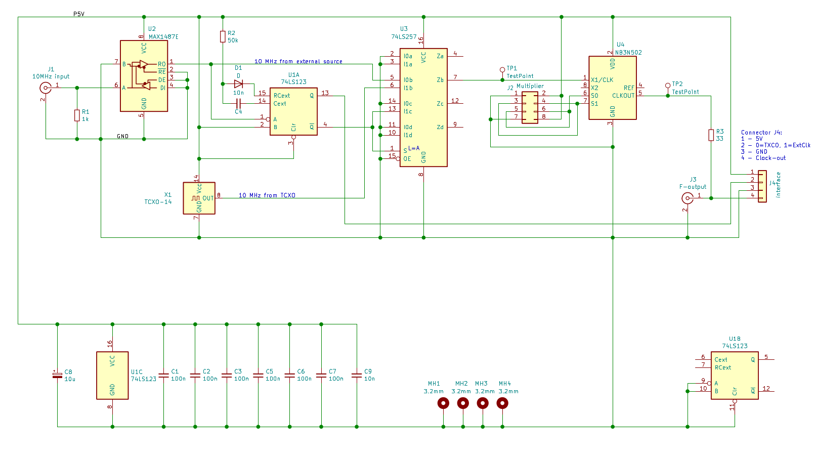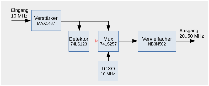 steht. Wird aber eine Referenzfrequenz am Eingang eingespeist, dann erkennt das der Detektor. Er schaltet dann den Umschalter (Mux) so um, das anstelle der TCXO-Frequenz die eingespeiste Frequenz weitergeleitet wird. Damit liegt am Ausgang des Schalters (Mux) immer 10 MHz an. Würde man nun 10 MHz benötigen, wäre man fertig. Braucht man aber eine andere Frequenz, dann kann man einen Frequenzvervielfacher nachschalten. Für den Frequenzvervielfacher gibt es mehrere technische Lösungsmöglichkeiten. Eine zeitgemäße ist der Einsatz eines speziellen Chips, der fast ohne Außenbeschaltung auskommt, des NB3N502. |