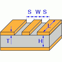| Microstrip Line Wenn durch die Leiterbahn in der Signalebene ein Strom fließt, dann geht man davon aus, das der Rückstrom durch die Masseebene fließt, und zwar direkt unterhalb der Signalleitung. Die Leiterbahn und die Massefläche entsprechen also den beiden Leitern eines Kabels. An anderer Stelle habe ich erläutert, wie sich die Induktivität und die Kapazität der Leiter durch Abstand und Größe der Leiter gegenseitig beeinflusst. Je kleiner der Abstand zwischen beiden Leitern (also je dünner die Platine) desto geringer ist die Induktivität und desto größer ist die Kapazität. Der Abstand ist aber durch das Platinenmaterial fest vorgegeben, zwischen Leiterbahn und Masseebene ist ja eine Schicht Isoliermaterial (meist Epoxy) konstanter Dicke. Aber auch die Breite der Leiterbahn ist wichtig. Je breiter die Signalleitung, desto größer wird die Kapazität zwischen Leiterbahn und Massefläche, auf die Induktivität wirkt sich die Leiterbahnbreite dagegen nur geringfügig aus. Da sich die Impedanz der Leitung auf der Platine aus Induktivität und Kapazität ergibt, kann man bei vorgegebener Platinendicke (H) die Impedanz mit der Leiterbahnbreite (W) einstellen. Für eine 1,6mm dicke Platine ergibt sich eine Impedanz von 50 Ohm bei einer 2,9 mm breiten Leiterbahn. Verwendet man eine nur 0,8mm dicke Platine, dann muss die Leiterbahn 1,45 mm breit sein. (Dabei gehe ich von normalem FR4-Platinenmaterial aus). Da sich 2,9mm dicke Leiterbahnen nur schlecht an kleine Steckverbinder oder ICs anschließen lassen, bevorzugt man dünnes Platinenmaterial mit 0,8mm Dicke. Bei 4-lagigen Platinen muss dann also die Isolation zwischen den beiden obersten Lagen 0,8mm dick sein. Rechts sieht man so ein Design, das nennt man Mikrostrip. Wer Deutsch bevorzugt, kann Wellenleiter sagen. |