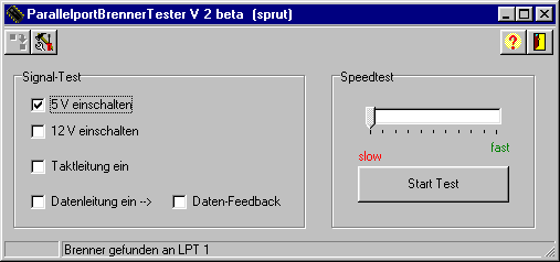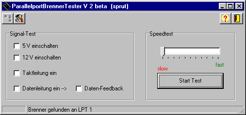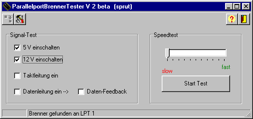 Der Brenner wird ohne PIC an den Druckerport des PC angeschlossen und mit der Spannungsquelle verbunden. Dann wird das Programm gestartet. Der Brenner wird erkannt. Falls nicht, kann der Test trotzdem durchgeführt werden, soweit der Brenner am Port LPT1 angeschlossen ist. |