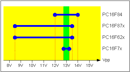 Die Brennersoftware P18 ab der Version V1.5 und die Brennersoftware PBrenbnerNG ab der Version V4.0 zeigen nach dem automatischen Erkennen des PIC-Typs auch die vorgeschriebene Programmierspannung an. Das kann als Orientierung dienen.