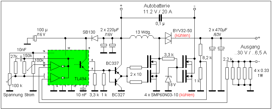 Impulsbreitenregler. Der IC steuert über eine Gegentaktstufe die eigentlichen Leistungstransistoren an. Ohne Gegentaktverstärker war es nicht möglich, schnelle Schaltzeiten zu erreichen um die Umschaltverluste klein zu halten. Als Leistungstransistoren werden Spezialtypen mit extrem kleinen Innenwiderstand verwendet.. Die Parallelschaltung von Transistorpaaren viertelt die Verluste in den Schalttransistoren. Eine 18V-Z-Diode schützt die Gates des zweiten