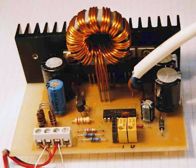 Die Drosselladung entlädt sich nun über die Diode in den Ausgangs-Elko. Die induzierte Spannung ist dabei weitaus höher als die Eingangsspannung. Eine Pulsbreite von ca 50 % ... 65 % bei einer Schaltfrequenz von 40 kHz hat sich als günstiger Wert erwiesen, um 20 V ..30 V zu erzeugen. Die Ausgangsspannung lässt sich mit einer Pulsweitenregelung einstellen, dafür kann man handelsübliche Schaltkreise benutzen. |