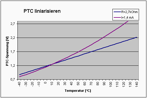 mit Reihenwiderstand Dem lässt sich entgegenwirken, wenn man keine Konstantstromquelle verwendet, sondern den PTC durch einen einfachen 2,7kOhm-Widerstand  (Metallschicht , TK=25) aus der 5V-Betriebsspannung speist. Der Strom durch die in Reihe geschalteten Widerstände ist nun vom Widerstand des PTC und damit von der Temperatur abhängig. Bei hohen Temperaturen ist der Strom etwas kleiner, und der Spannungsabfall über dem PTC ist dadurch etwas geringer als bei Konstantstrom.