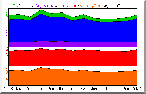 Ca. 45000 ... 50000 Hits am Tag! Das sind 150% des Vorjahreswertes. Obwohl Strato eigentlich ein monatliche Trafficlimit von 20 GByte hat, erlauben sie mir bis zu 30 GByte. Am November 2006 wird das Limit auf 50 GByte heraufgesetzt (danke).