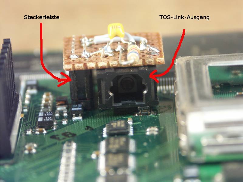 TOS-Link-Sender TOTX173, in den das TOS-Link-Kabel eingesteckt werden
