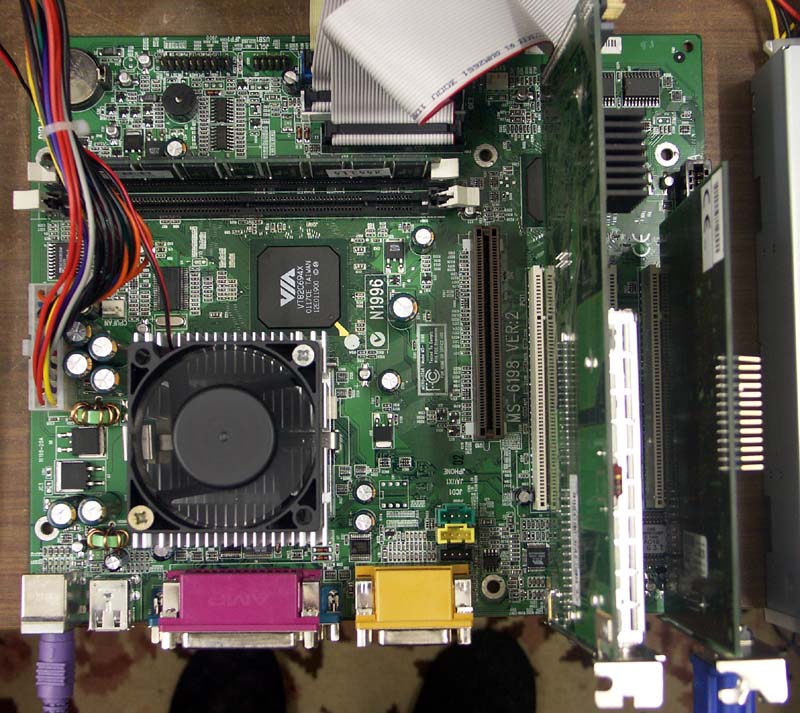 Nun war es zeit, die überflüssige Grafikkarte zu entfernen, und in den dadurch frei gewordenen PCI-Slot eine DVB-S-Budget-Karte einzusetzen. Da kam die Ernüchterung: Das Board weigerte sich, ohne Grafikkarte zu booten! Es blieb mir nichts weiter übrig, als die AGP-Grafikkarte aus meinen Werkstatt-PC in den VDR zu transplantieren. Diese Elsa Erazor II sitzt nun im VDR und erfüllt dort nur folgende absolut überflüssige Funktionen: