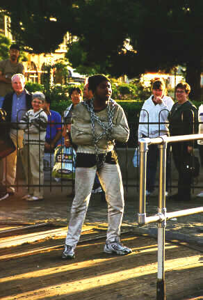Das ist z.B. Escapeman, der die Wartenden an der Cablecar-Endstation unterhält. Während er sich aus Ketten und Zwangsjacke "befreit" gibt er lautstarke Kommentare ab. Natürlich erwartet er dann hinterher auch ein paar Dollar von seinen Zuschauern.