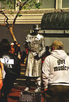 Silverman steht an Market Street Ecke Powel. Er versucht mit seinem Outfit und roboterhaften Bewegungen die Aufmerksamkeit der Passanten auf sich zu lenken.
