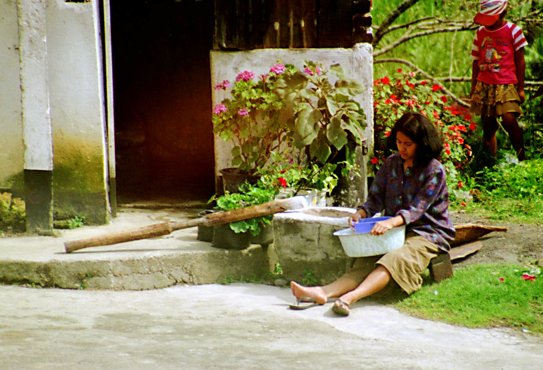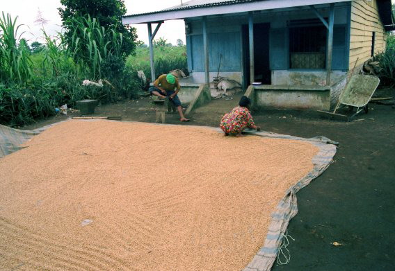 Vor allen Bauerhäusern befindet sich ein festgestampfter Platz, auf dem die Ernte getrocknet wird. Man breitet die Ernte aus, und schichtet mit einer Harke von Zeit zu Zeit um. |