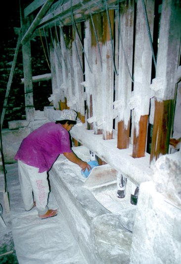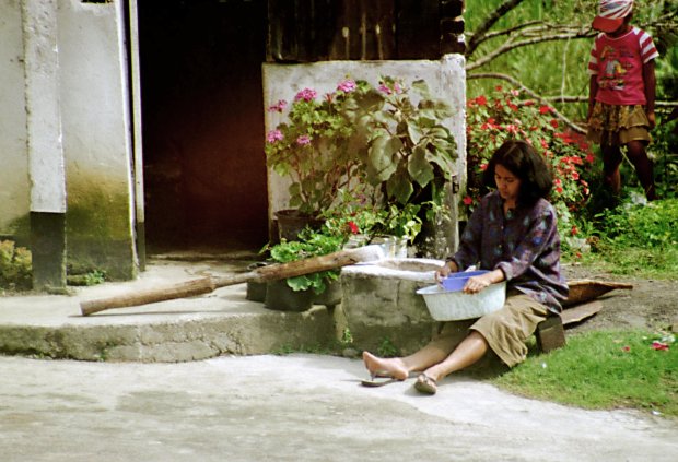 | Der Teig ist gleich fertig. Vorher wurden natürlich die Körner im Mörser zu Mehl zermahlen. Alles Handarbeit. | ![]() |