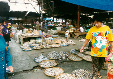 | Der Fischmarkt in einer Markthalle einer Provinzstadt. | ![]() |