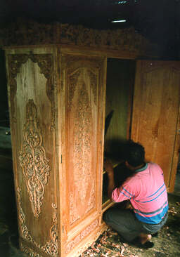 Dieser Schrank aus massivem Holz trägt Schnitzornamente an allen Türen und den Seitenwänden, die gerade mühsam in Handarbeit hergestellt wurden. Minuten später wird dieser Schrank aus der Werkstatt getragen und draußen mit weißer Farbe lackiert. |