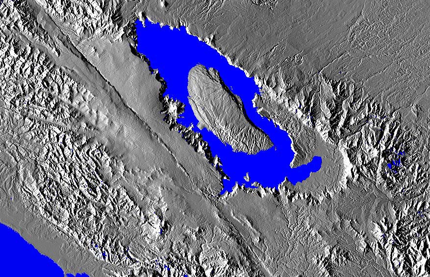 Die Südküste des 905 Meter hoch gelegenen Toba-Sees liegt durchschnittlich 500 Meter über dem Pegel des Toba-Sees, die Nordküste immerhin noch 300 Meter. Der Berg im See ist über 1600 Meter hoch, und ragt somit 700 Meter aus dem See heraus. Wenn der See wirklich der Rest eines explodierten und eingestürzten Vulkans ist, dann muss die Explosion damals wohl weltweit Auswirkungen (z.B. Ascheregen) gehabt haben. Südwestlich des Sees sieht man eine langezogene Linie, das ist eine Faltungszohne zwischen der Süd-Asiatischen-Erdplatte im Norden und der Indo-Australischen Erdplatte im Süden. |