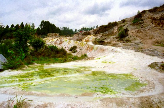 | Vom Vulkanismus zeugen auch Schwefelquellen wie hier. Der mit dem Wasser an die Oberfläche gelangte Schwefel setzt sich hier ab. | ![]() |