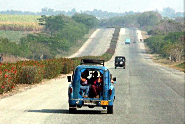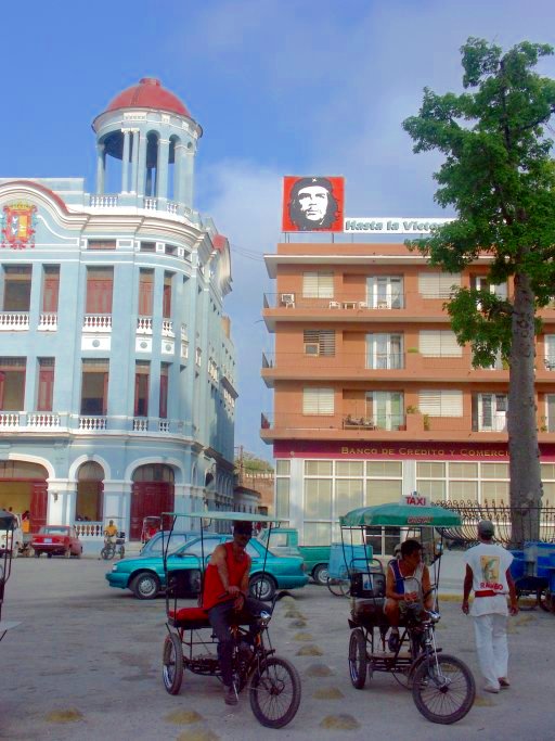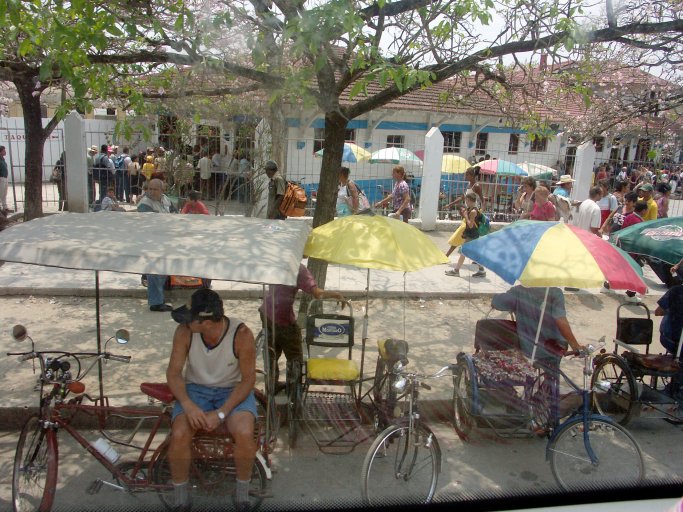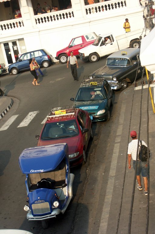 Bunte Mischung am Taxistand. Hier gibt es "Dreiräder", normale Autos und Oldtimer. |