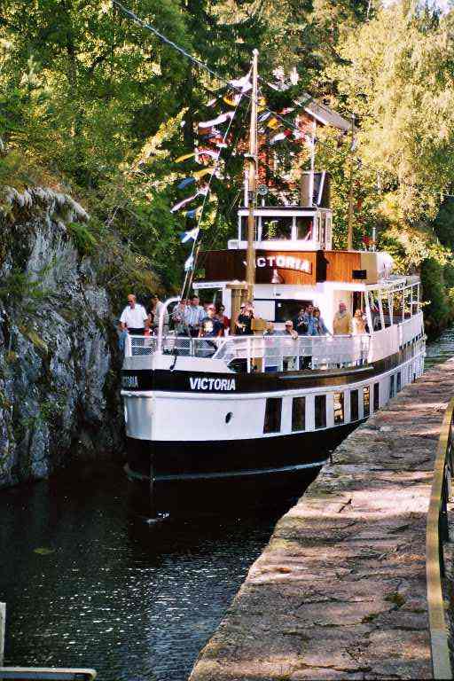 Zweimal am Tag fährt die Viktoria auf dem Kanal Touristen herum. Das Schiff wurde extra für den Kanal gebaut, und passt exakt in die Schleusenkammern. |