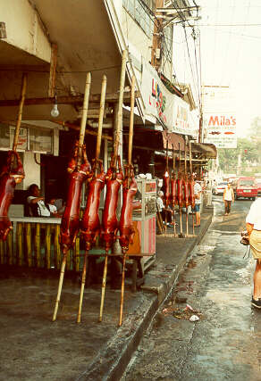 In einem Viertel Manilas versteht man es hervorragend Spanferkel über offenem Feuer zu grillen. Wer Appetit auf ein gutes Stück hat wird hier fündig. Aber auch die Warenpräsentation allein lohnt einen Besuch. Man sollte auch unbedingt mal einen Bilck auf die "Öfen" werfen. Mehrere offene "Grills" wurden nebeneinander gemauert. Ihre Stirnseiten enden an einer gemeinsamen Mauer. Durch Löcher in der Mauer ragen die "Drehstangen" in einen Gang, auf der anderen Mauerseite. Von hieraus können die Frauen die Spanferkel über dem Herd drehen, ohne direkter Hitze ausgesetzt zu sein. |