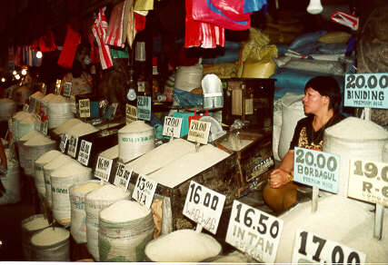 Reisstand in einer Markthalle läßt die Bedeutung des Hauptnahrungsmittels