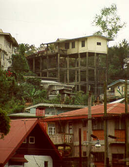 | Da viele Grundstücke im bergigen Luzon am Hang liegen, ist eine große Hausbaukunst gefordert. Oft ist auf der Hangseite ein zwei- bis vier-stöckiger Unterbau aus Stahlbetongstreben erforderlich, um das Haus auf Höhe der Straße errichten zu können. | ![]() |