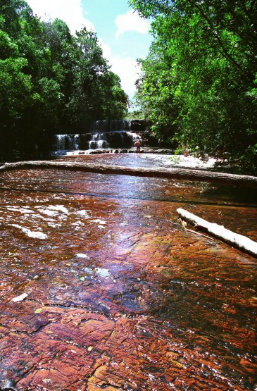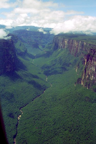 Auch wenn die Gran Sabana auf den ersten Blick flach erscheint, finden sich doch immer wieder kleine Flussläufe, die dutzende Meter in Schluchten stürzen, die das Wasser im Laufe der Zeit ausgewaschen hat.