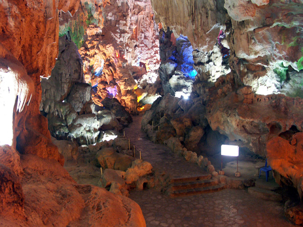 In einigen Inseln befinden sich große Höhlen. Die farbenfrohe Beleuchtung ist Geschmackssache, aber die Ausmaße sind wirklich beeindruckend |