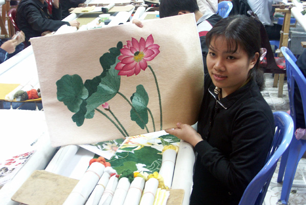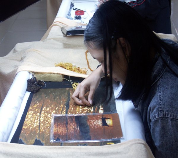 Vietnam wird in der Regel das ganze Bild vollflächig bestickt. Selbst auf diesem Lotusblumenbild ist der einfarbige Hintergrund vollständig gestickt. Dieses Mädchen ist übrigens gehörlos. |