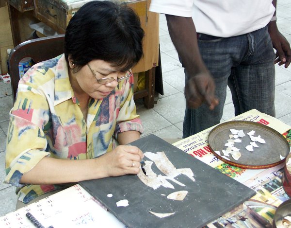 Kinder mit geistigen oder körperlichen Behinderungen geboren. (Etwa 500000 Vietnamesen leiden heute noch unter den Folgen des Gifteinsatzes.) Viele der Kinder finden eine Ausbildung und Beschäftigung in kunsthandwerklichen Werkstätten. Typisch sind z.B. Werkstätten in denen mit Seidengarn Bilder auf einen Trägerstoff gestickt werden. Die mit enormen Zeitaufwand hergestellten Stickereien eignen sich gut als Souvenier. Das Foto zeigt ein Mädchen, das eine Stickerei nach einerm Foto erstellt. |